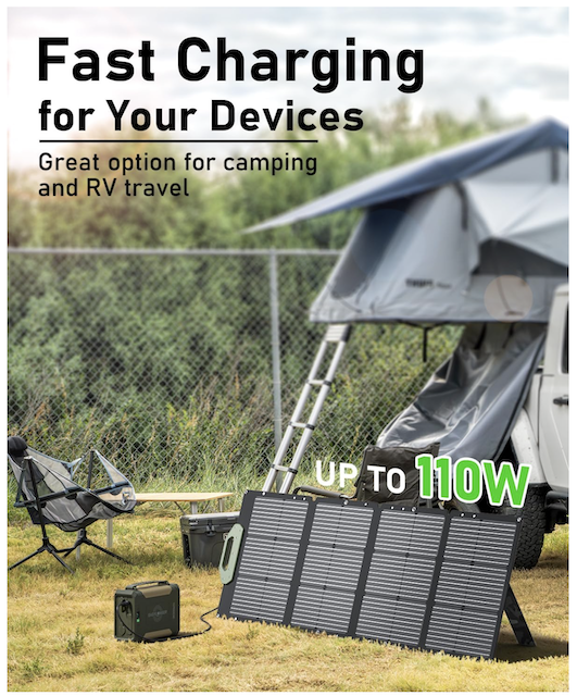 Why 100W+? A 100-110W panel like the ESP110 Solar Panel can fully charge a 300Wh battery in 5-7 hours of good sunlight. Smaller panels (50-60W) would take 10+ hours, which isn’t practical when you’re also trying to charge during daylight hours only.